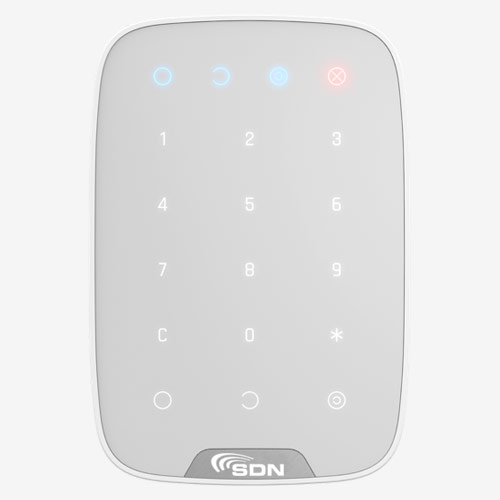 Teclado táctil inalámbrico para interior, con sirena incorporada y conexión permanente a nuestra CRA, con sistema de lectura, sin contacto directo, por tarjeta/llavero personalizado por usuario para conexión y desconexión del sistema de alarma.